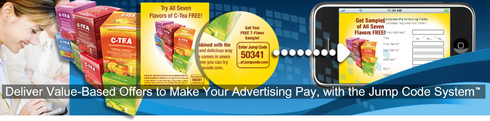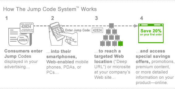 Now, with the Jump Code system, you can develop far more effective Web locations custom-targeted to the promotional offer, coupon, savings offer, free sample, product detail screen, or any other promotion reachable from any print, on-air, or other “offline” ad placement, to engage consumers the moment they become interested in your product, from any device they’re using: PC, Web-enabled mobile phone, or smartphone.