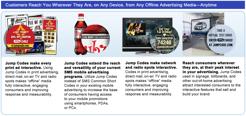 With the Jump Code System, your “offline” advertising in print, broadcast, outdoor or any other medium becomes a seamless pathway to the online interactions that attract new consumers, build brand awareness, and boost product purchases in every channel—for mobile phones, smartphones, Web-enabled PDAs, PCs, or any Net-connected user.