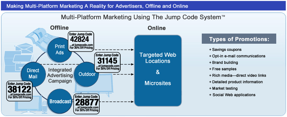 With the Jump Code System, you can create this new multiplatform pathway for consumers, linking them easily from your advertising to your promotions, targeted information, or any other trackable, measurable content or media that’s part of your marketing process, online.