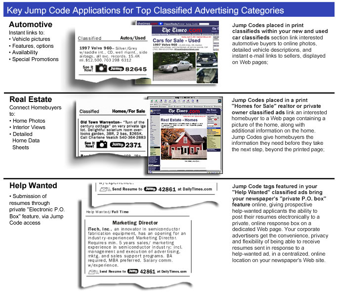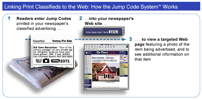 The Jump Code System boosts your classified advertising department's value-added revenues, and your newspaper's companion Web site's usage, helping to protect your print classified advertising business against increasing competition from Net-based classified advertising and online auction sites.