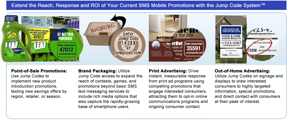 With the Jump Code System, you can replace your current SMS Short Code-based mobile advertising programs, to reach the widest possible base of consumers using any Web-enabled mobile device, smartphone, or PC, linking these consumers instantly to a wider range of the targeted Web-based promotions and rich media that engage consumers and build measurable sales response in both online and traditional advertising.