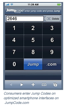 The Jump Code System expands the reach of print and other offline advertising promotions beyond the limitations of SMS short code-based promotions, enabling you reach any consumer using any Web-enabled device, not just yesterday’s cell phones using limited, 1985-era SMS text messaging technology.